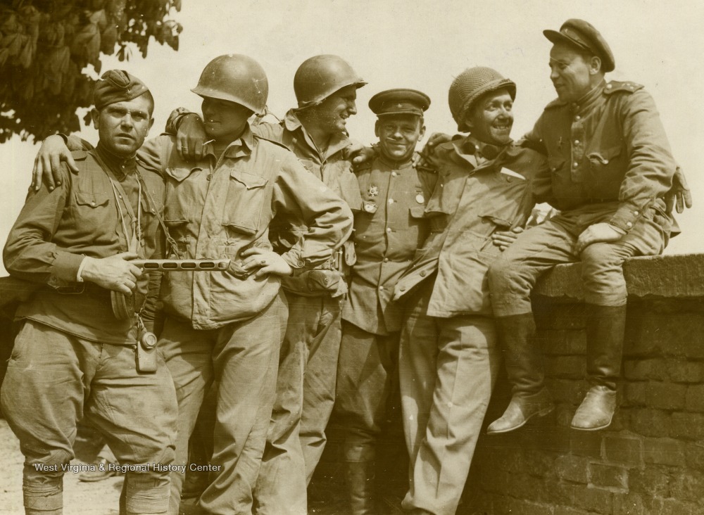 - Information on back of photo reads: "Firm contact has been established between ground forces of the First American Army and those of the Russian Army. The historic meeting took place in the town of Torgau, on the Elbe River, 75 miles south of Berlin, when First Army troops met forward elements of the Russian Guards Division."