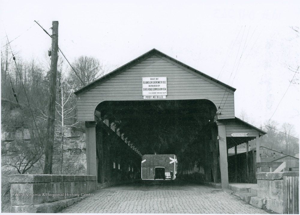 - Sign on bridge in photograph reads: "Built by Eli and Lem Chenoweth 1852. Repaired by State Road Commission 1934."