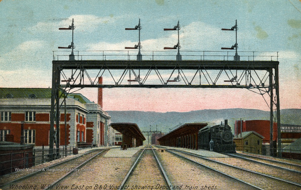 - View East on Baltimore and Ohio Viaduct Showing Depot and Train Sheds, Wheeling, W. Va.