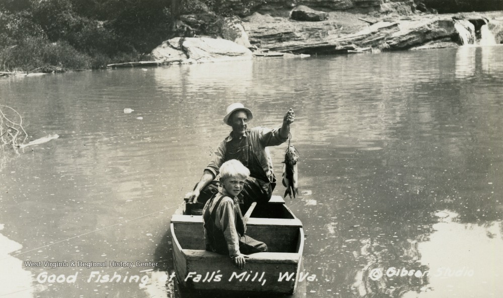 - Man and young boy out fishing on Fall's Mill. Man is holding a couple of catfish on a line. (From postcard collection legacy system.)