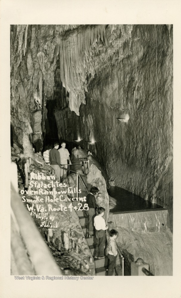 - Visitors observe the stalactites that cover the Smoke Hole Caverns. (From postcard collection legacy system.)