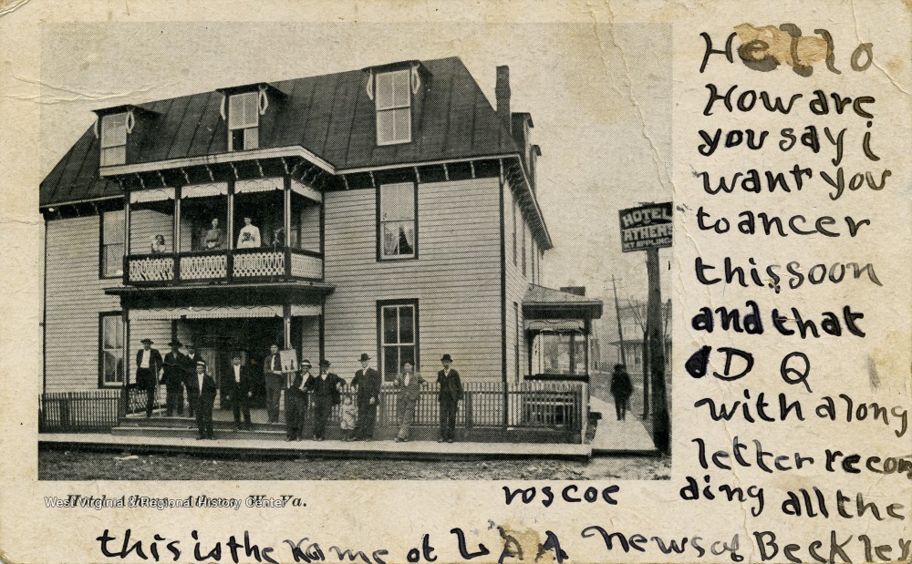 - Group of people stand out front and on the balcony of the Hotel Athens. See original for correspondence. Published by W.G. Lowe. (From postcard collection legacy system.)