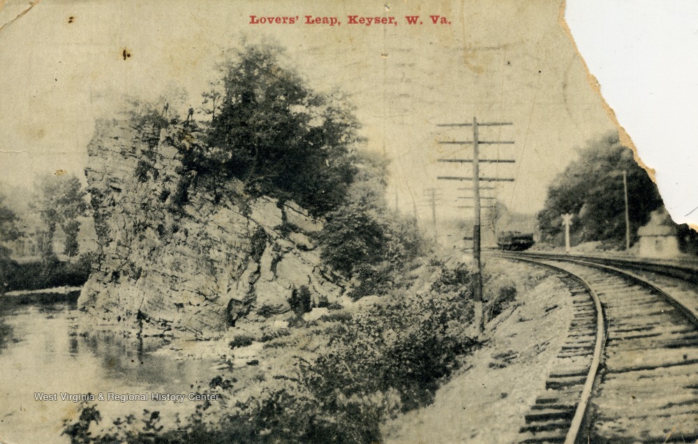 - Two people stand atop the giant rock formation to the left of the railroad tracks. See original for correspondence. (From postcard collection legacy system.)