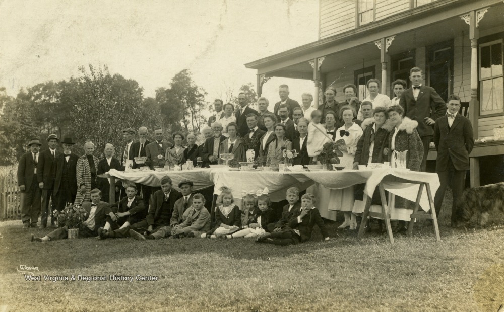 - Large gathering outdoors around makeshift dinner table. (From postcard collection legacy system.)