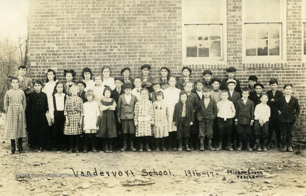 - Vandervort School children and teacher Hiram Evans pose for picture outside of school building. (From postcard collection legacy system.)