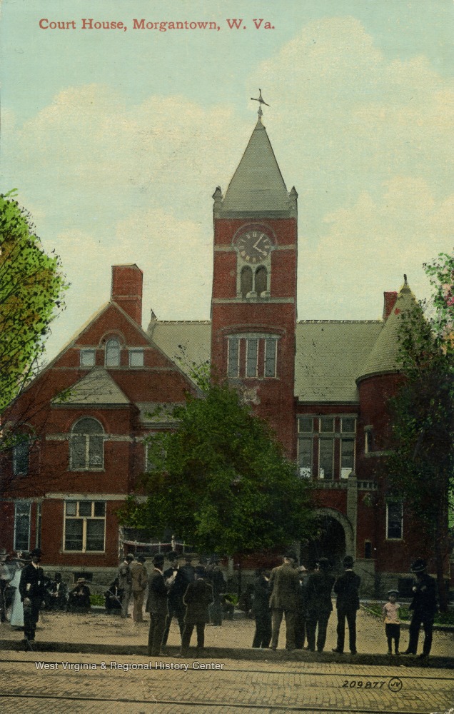 - People gathered out front of the court house in Morgantown, W. Va. Published by The Leighton and Valentine Company. (From postcard collection legacy system.)