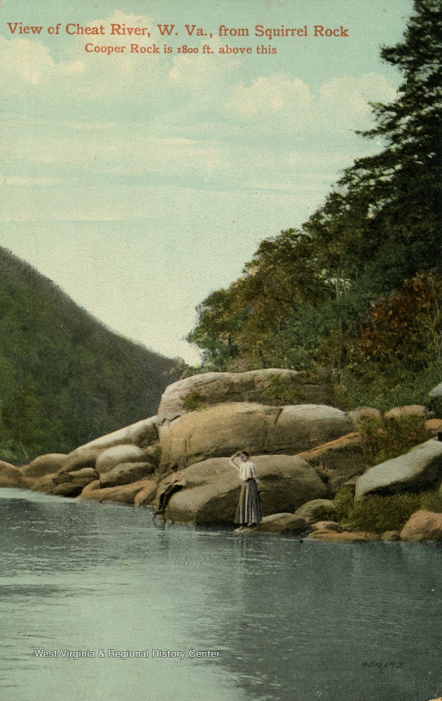 - Coopers Rock is 1,800 ft. above this. Woman and child relax on rocks by the edge of the river. (From postcard collection legacy system.)
