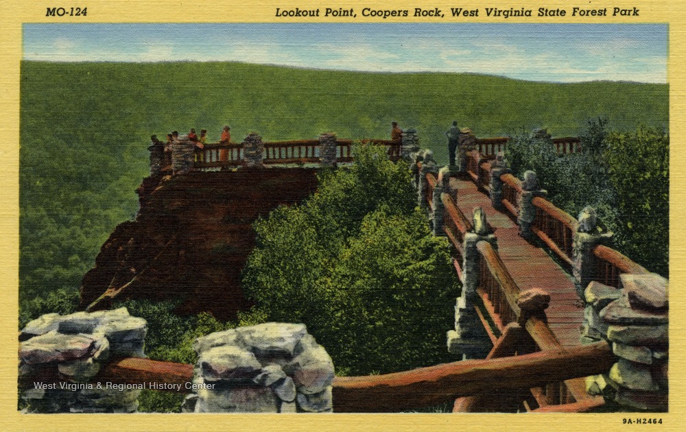 - Caption on back of postcard reads: "Ranger service, large parking areas, a refreshment concession and other conveniences for the visitor help to make Cooper's Rock a popular daytime resort, near Morgantown, W. Va. Published by Minsky Brothers and Company. (From postcard collection legacy system.)