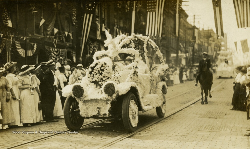 - Car Covered in Flowers Drives Down U.S. Flag Lined Streets During Parade; Wheeling, W. Va.