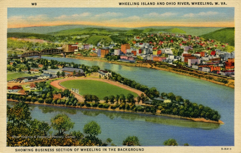- Showing business section of Wheeling in the background. Racetrack can be seen on the island. Published by Photo Crafters. (From postcard collection legacy system.)