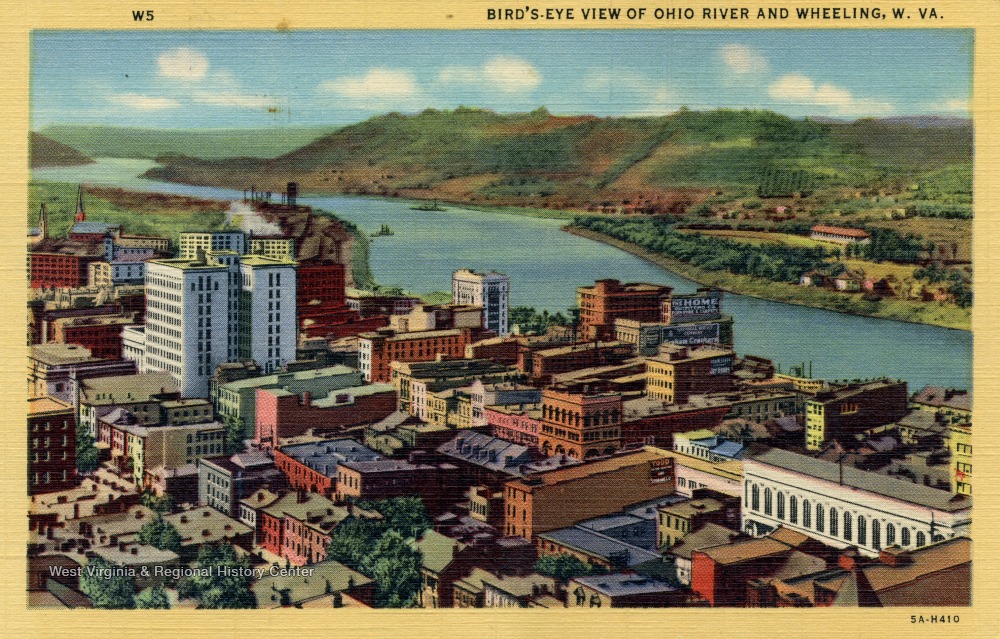 - Caption on back of postcard reads: "Ebenezer Lane made the first white settlement now occupied by the city of Wheeling in 1769. Indian warfare was on for several years until the Revolutionary War, progress then started. In 1832 the first iron works were built. The Baltimore and Ohio Railroad reached the city in 1852." Published by Arco Agency. (From postcard collection legacy system.)