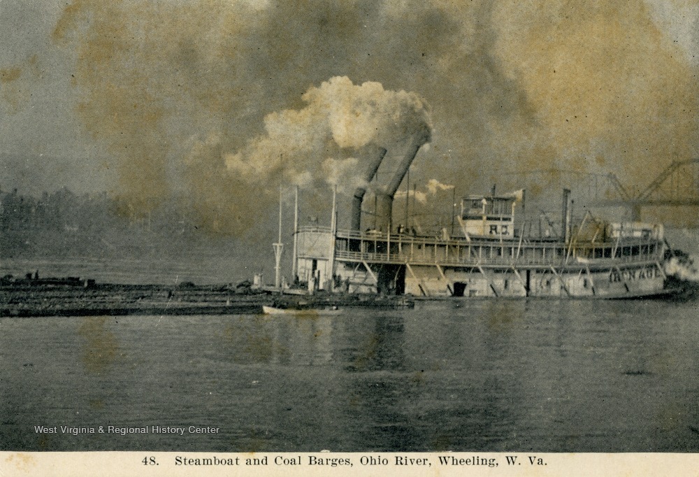 Steamboat and Coal Barges, Ohio River; Wheeling, W. Va.