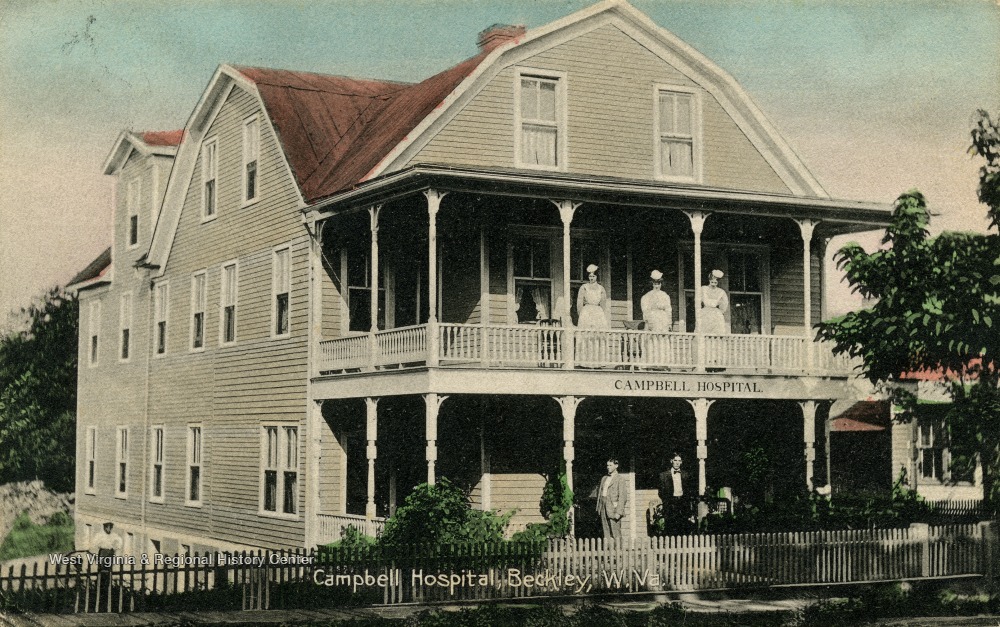 - Several Nurses and Men Stand on Porches of Campbell Hospital, Beckley, W. Va.