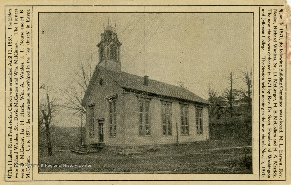 - Caption on postcard reads: "The Hughes River Presbyterian Church was organized April 12, 1835. The Elders were Richard Wanless, Sr., David McGregor, and Wm. McKinney. The Trustees were D. McGregor, Jas. H. Harris, Wm. A. Wanless, J.T. Nourse, and H.B. McCollum. Up to 1871, the congregation worshiped in the log church in Egypt. Jan. 5, 1970 the following Building Committee was elected, M.L. Earnest, Rev. Nourse, Richard Wanless, Sr., D. McGregor, H.B. McCollum, and H.A. Merrick. The new church was dedicated in 1871 by Rev. Dr. Scott, President of Washington and Jefferson College. The Session held a meeting in the new church Nov. 5, 1870." See original for correspondence. (From postcard collection legacy system.)