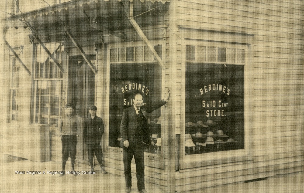 - Caption on back of postcard reads: "In 1908 our founder, K.C. Berdine, posed in front of the "new" Berdines Variety Store. The ladies dress hats in the window were 10 cents, but nothing in the store cost more!" (From postcard collection legacy system.)