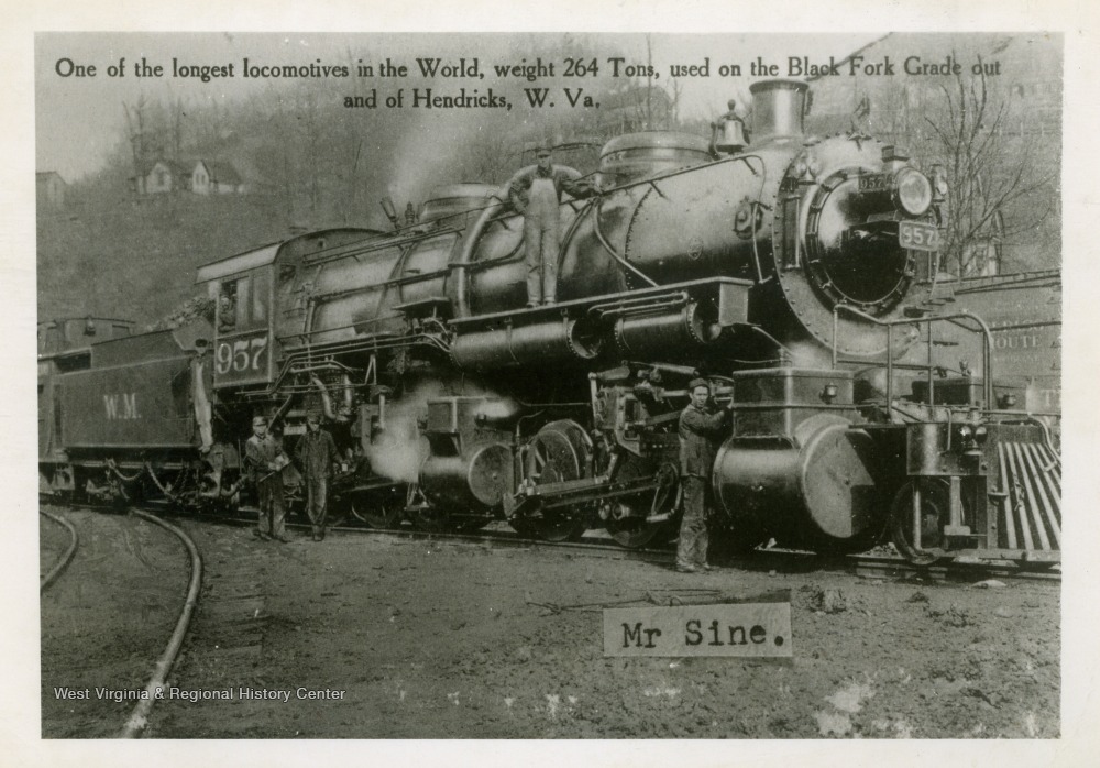 - Weight of locomotive is 264 tons. Mr. Sine stands at the front of the locomotive along with several other workers. Published by West Virginia Photo Company. (From postcard collection legacy system.)