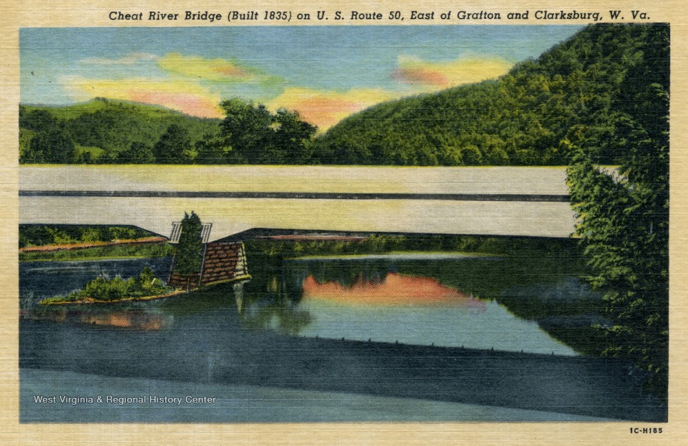 - Cheat River Bridge built in 1835. Published by Grafton Souvenir. (From postcard collection legacy system--subject.)