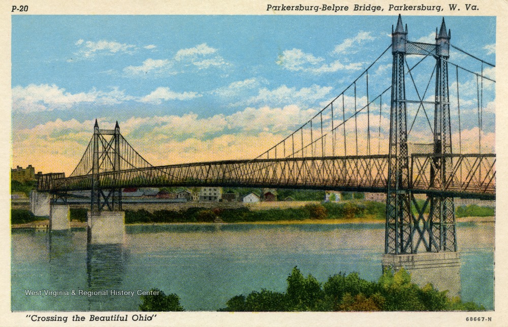 - Caption on back of postcard reads: "The Parkersburg-Belpre Bridge on U.S. Route 50 and near Ohio 7 was built in 1915. Is of suspension type, four spans of 800 ft., 300 ft., 400 ft., and 200 ft., respectively. Roadway is 25 foot width, with a 5 foot sidewalk. Purchased by the State of W. Va. on June 17, 1937 for the sum of $1,088,000." Published by Genuine Curteich. (From postcard collection legacy system--subject.)