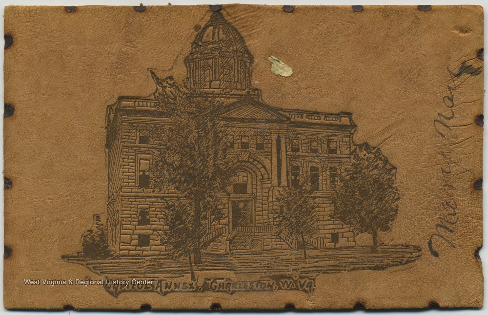 - Postcard made from leather and engraved with an image of the Capitol Annex which held the State Archives.(From postcard collection legacy system--subject.)