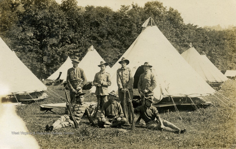 - Group of soldiers pose in front of tents. (From postcard collection legacy system--subject.)