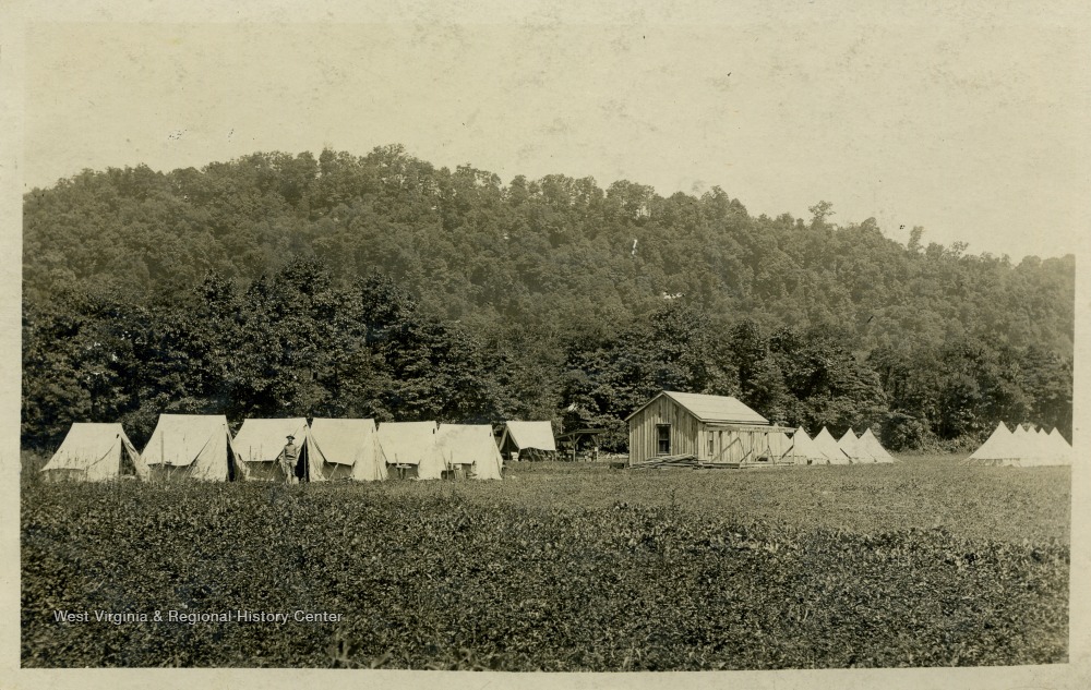 - Lone soldier stands guard outside of tents. (From postcard collection legacy system--subject.)