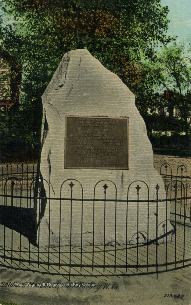 - Inscription on monument reads: "In memory of the soldiers of the American Revolution buried in Wood County. Capt. James Neal, Capt. John James, Lieut. Samuel Bell, Ord. Sergt. Francis Langfitt, Bailey Rice, Richard Mathew, Matthew Maddox, and Spencer Sharp. These men freely offered on the altar of their country their lives, their fortunes, and their sacred honor. Erected by the James Wood Chapter, Daughters of the American Revolution - 1908." Published by The Leighton and Valentine Company. (From postcard collection legacy system--subject.)