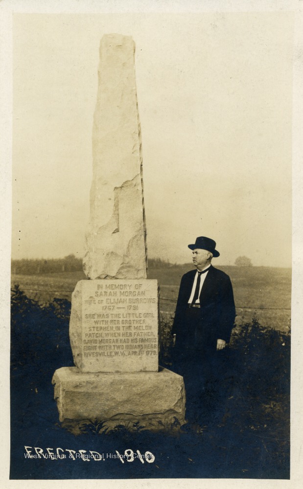 - Inscription on monument reads: "In Memory of Sarah Morgan Wife of Elijah Burrows 1767-1791. She Was The Little Girl With Her Brother Stephen, In The Melon Patch, When Her Father David Morgan Had His Famous Fight With Two Indians Near Rivesville, W. Va. April 1, 1773." Monument erected in 1910. (From postcard collection legacy system--subject.)