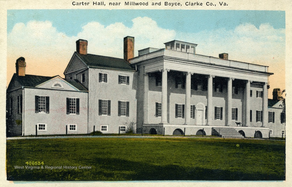 - Caption on back of postcard reads: "Carter Hall erected about 1792 by Colonel Nathaniel Burwell. Sometime the home of Wm. A. Carter, latterly of Mr. Geo. Burwell and now the residence of Mr. Townsend Burwell." Published by Williamsport Paper Company. (From postcard collection legacy system--Non-WV.)