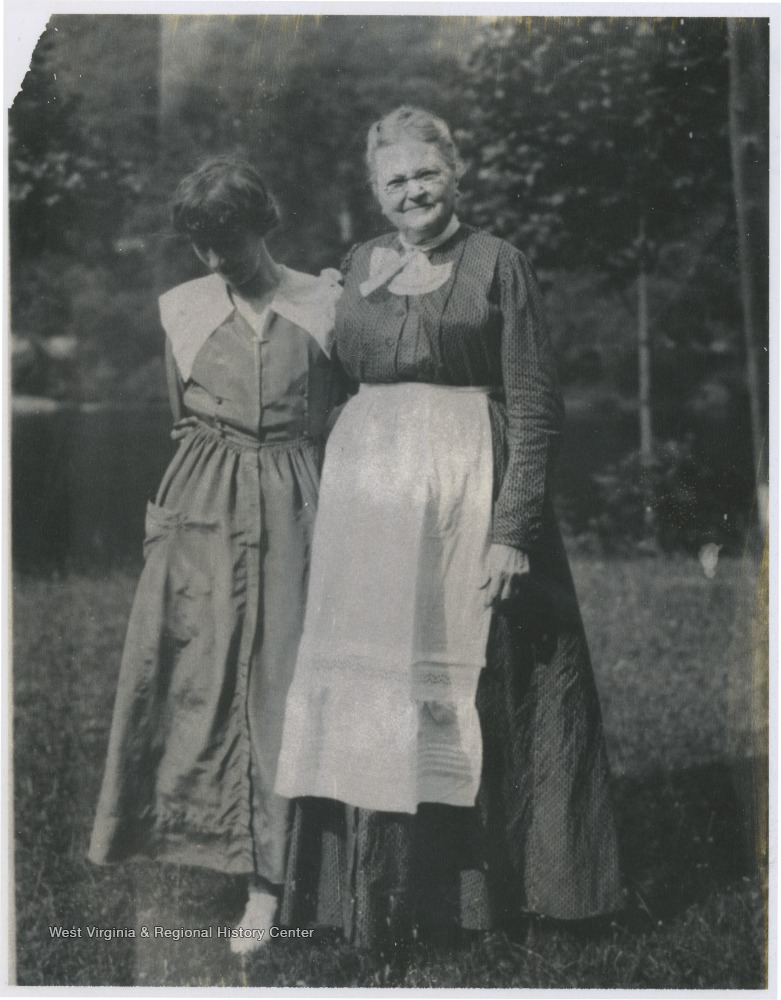 - Susan Catherine Finnell Johnson, mother of Mrs. Lucy B. Johnson, and Mrs. Anna Fitch pose in front of the house located on Rockley Road in Morgantown, W. Va.