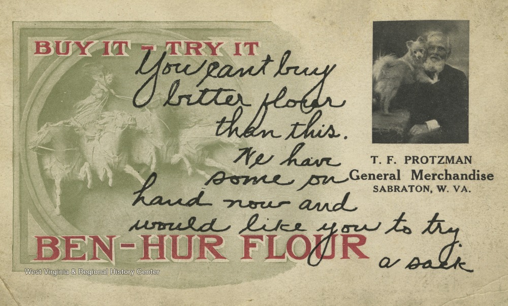 - Postcard reads, "Buy it-Try it. You can't buy better flour than this. We have some on hand now and would like you to try a sack."