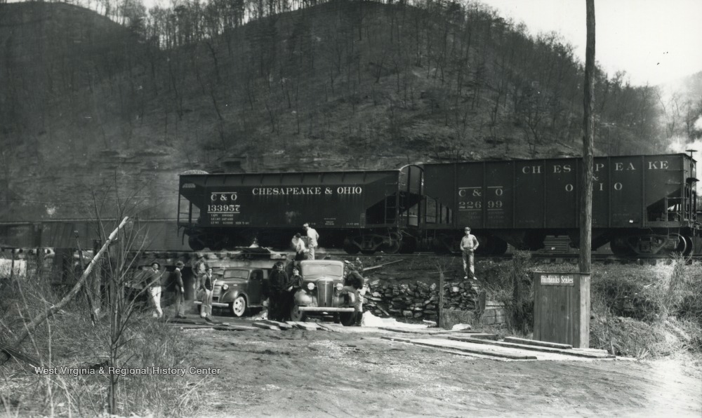 - Men stand by parked cars by the Chesapeake & Ohio Railroad. Subjects unidentified.