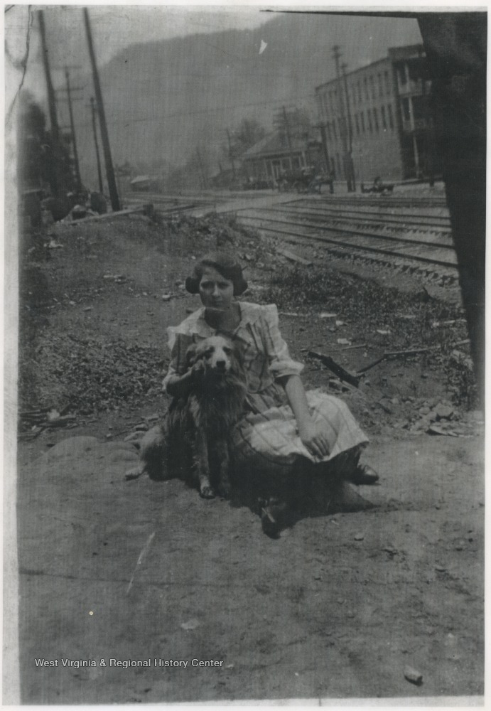 - A girl poses with a dog by the railroad tracks. Subject unidentified.