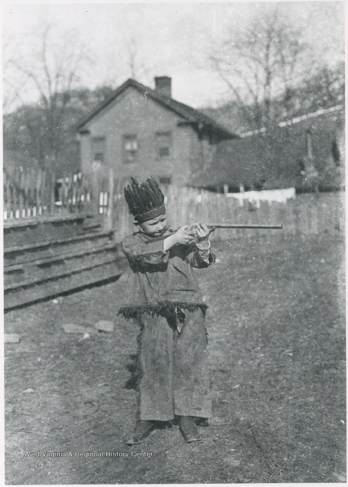 - A young boy dressed as an Indian aims his toy pistol. Subject unidentified.