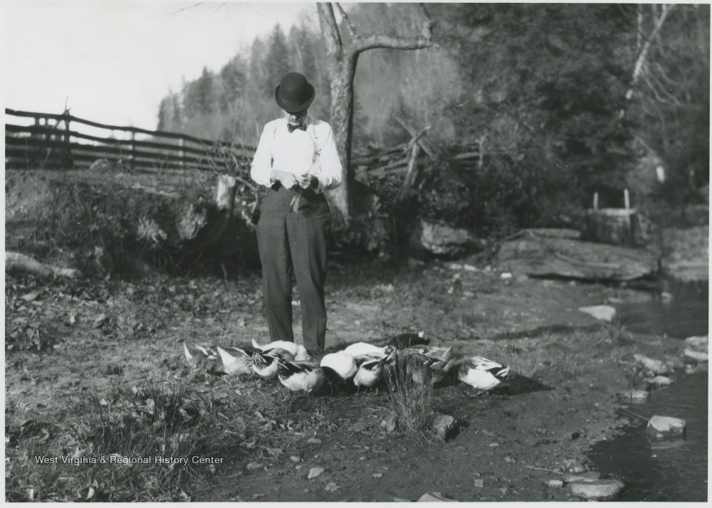 - An unidentified men feeds the small flock of chikcens by his feet.