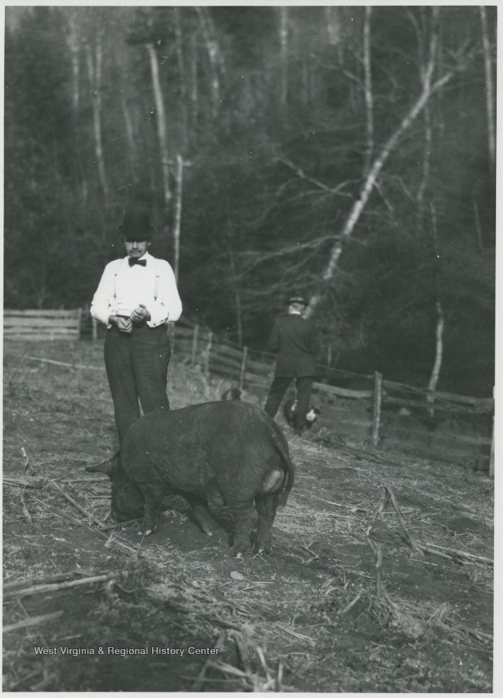 - An unidentified man stands inside a pig pen with a very large pig sniffing by his feet.