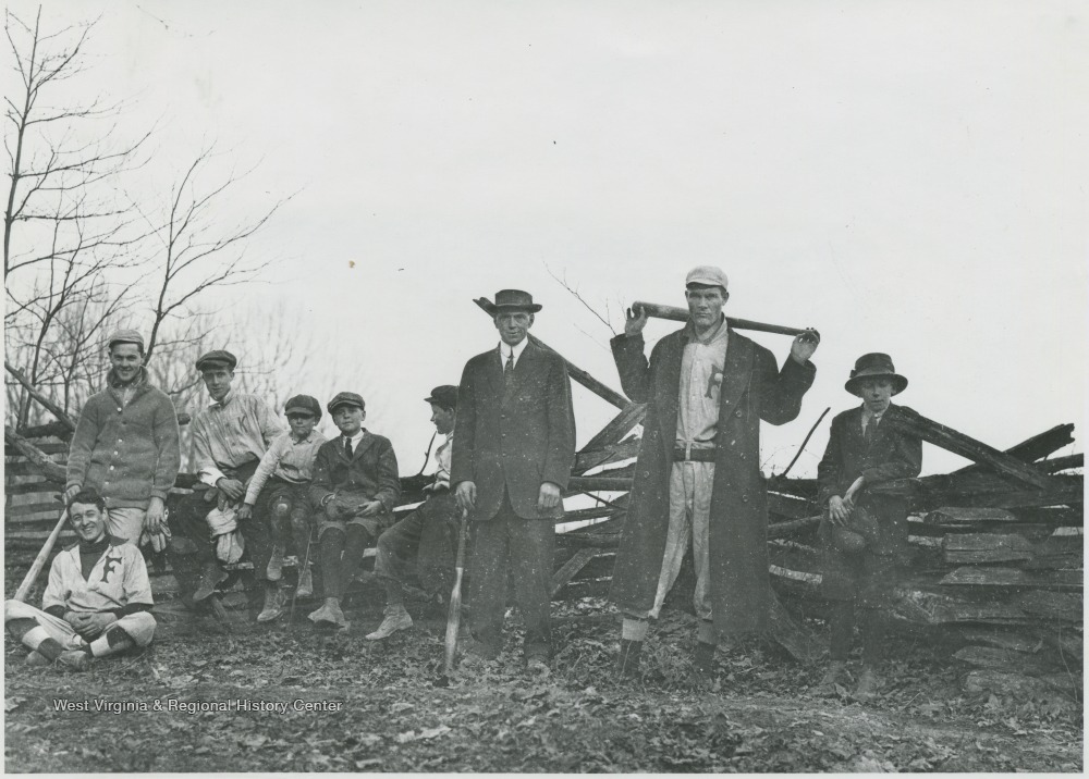 - A group poses with baseball bats and gloves by a fence. Subjects unidentified.