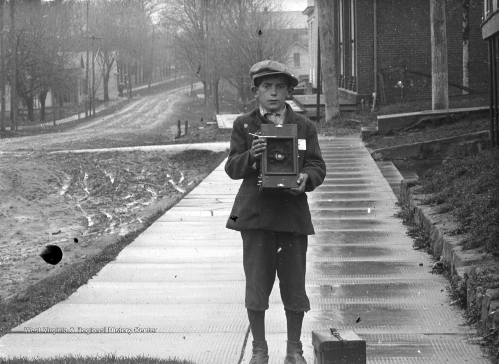 - Boy Holding Camera on Sidewalk, Foxburg, Pa.