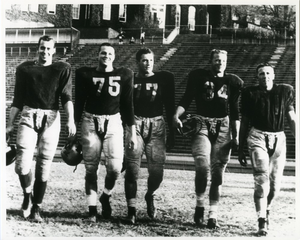 - West Virginia University football players, L to R: running back Bobby Moss, Captain and All-American lineman Sam Huff, All-American lineman Bruce Bosley, running back Joe Marconi, and quarterback Fred Wyant, leave Mountaineer Field after practice. Note Woodburn Hall can be seen in the background.