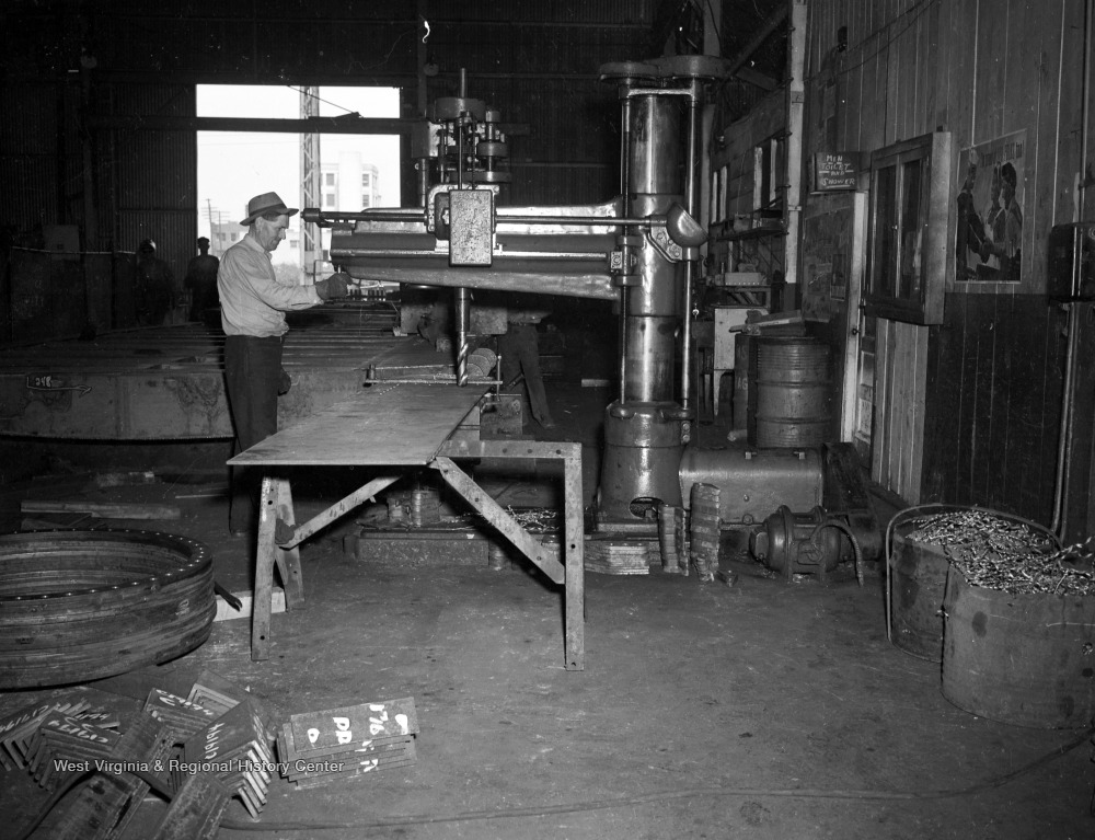 Man Operates Large Drill Above Piece of Steel at W. Va. Steel Corporation, Charleston, W. Va.