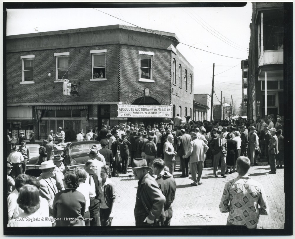 - A crowd surrounds the building located on 3rd Avenue. The sign at the entrance reads, "Building and All Stock and Fixtures To Be Sold at Absolute Auction, Saturday at 10:00 a.m." Subjects unidentified.