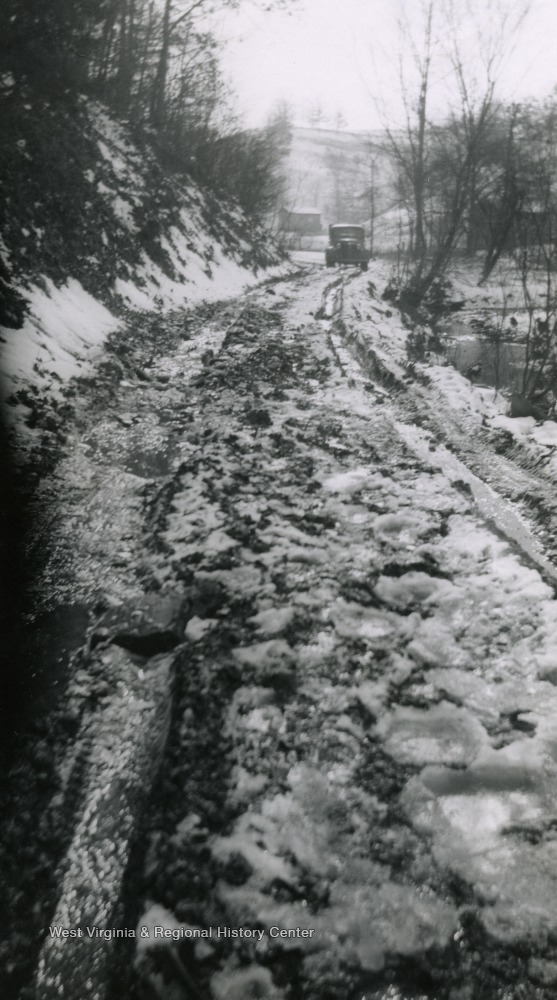 Truck in Distance Travels Down Snow and Ice Covered Buzzard Road, Leon, W. Va.