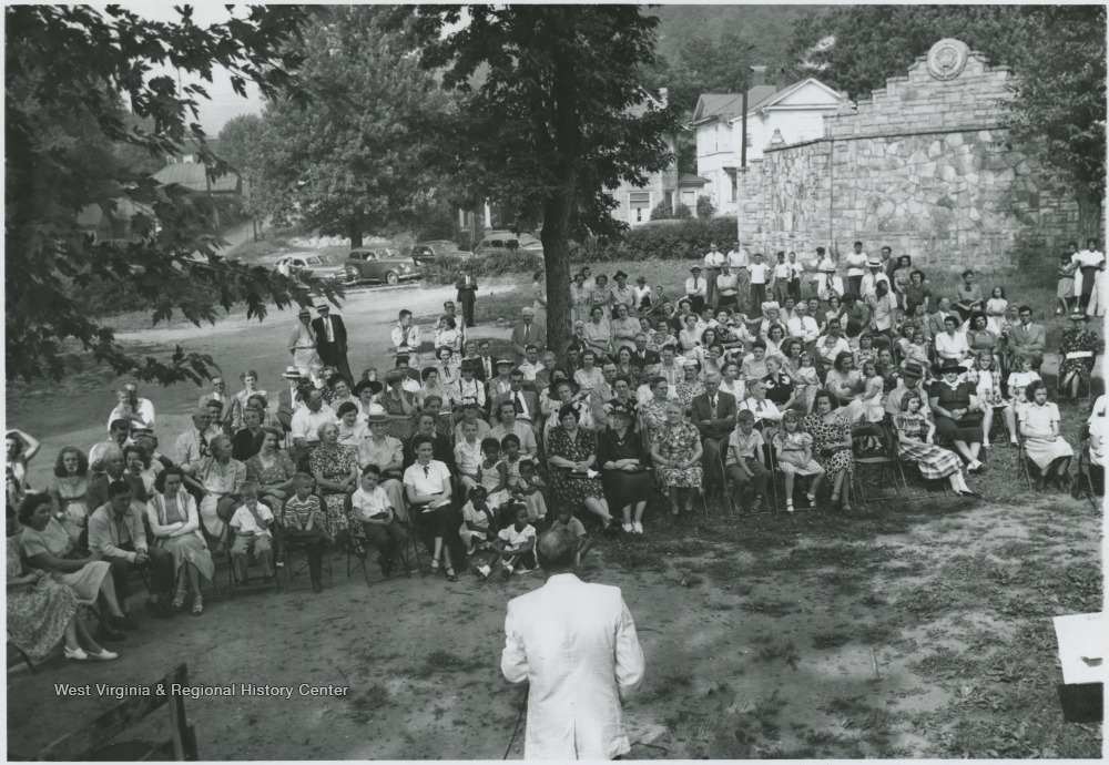 - A crowd assembles on the lawn to hear a speaker. Subjects unidentified.