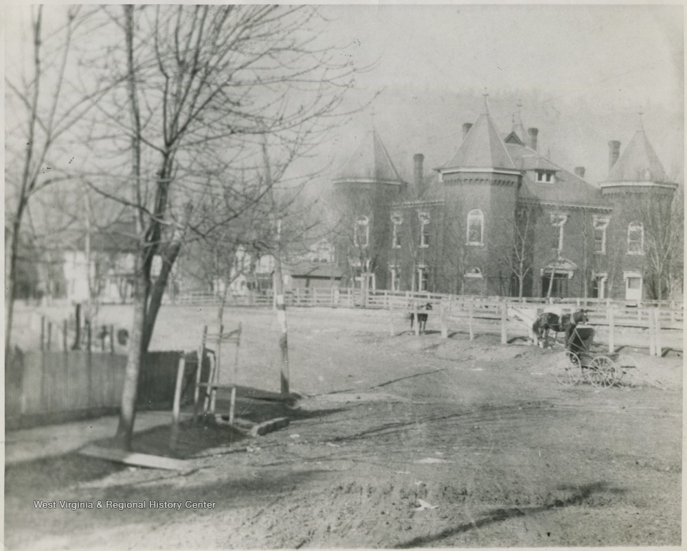 - Looking at the building from across a field. A horse and old-fashioned baby stroller are pictured on the right.