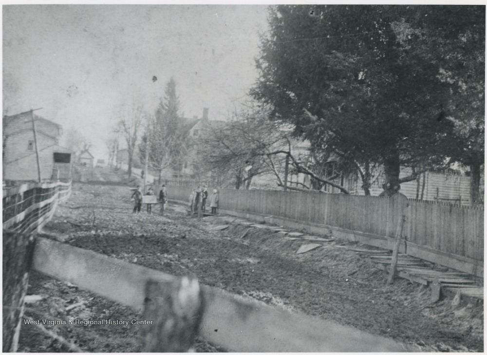 - A group of boys pictured in the distance walk along the dirt road. Subjects unidentified.