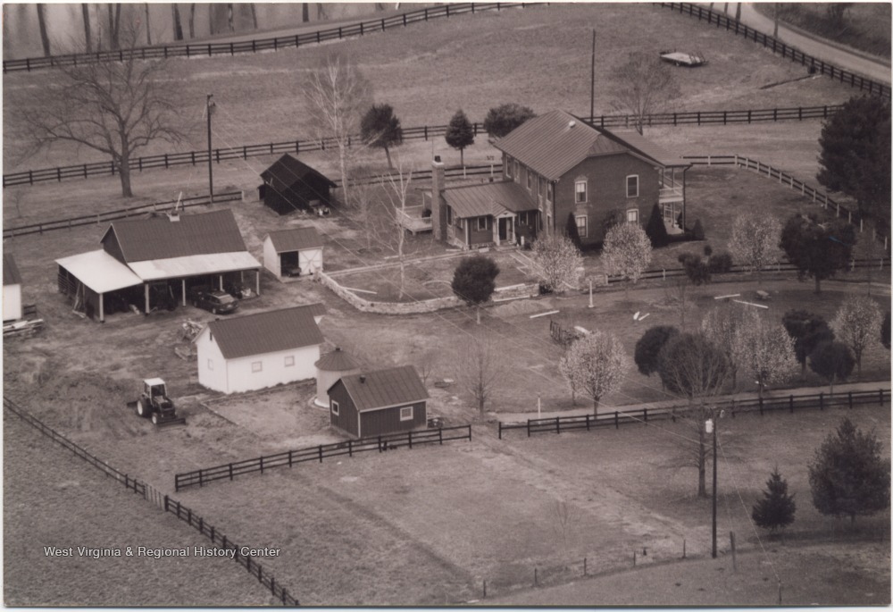 - Aerial view overlooking the Gwinn home and farm grounds.