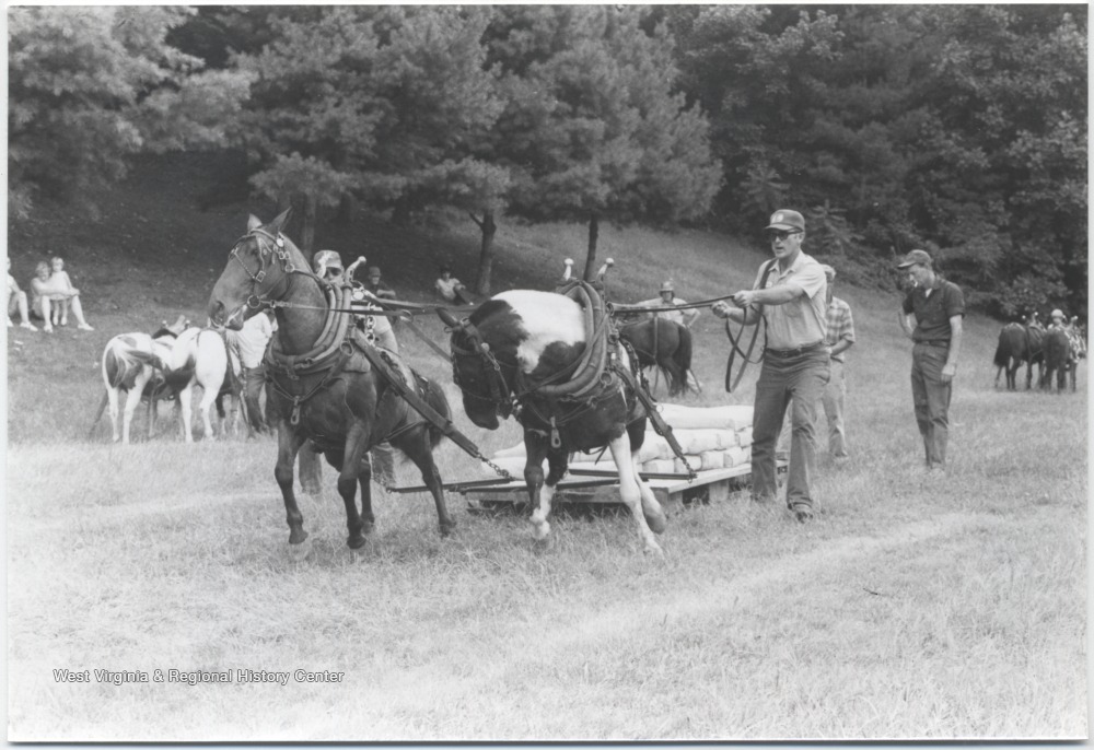 - Two horses pulling a heavy load. A man stands beside the animals to guide them.