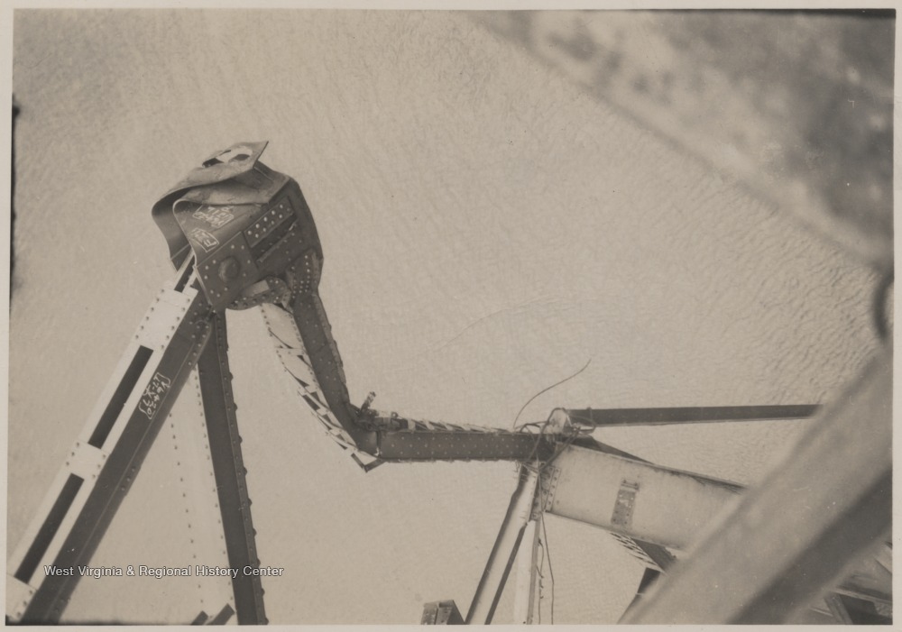 - A close-up look at the bent bridge steel.A week after the collapse the men began dismantling the twisted span, using a never before used technique by burning the steel beams with chemicals.Five workmen killed and four injured when the 300-ton span buckled and folded downward into the mouth of Bluestone River.