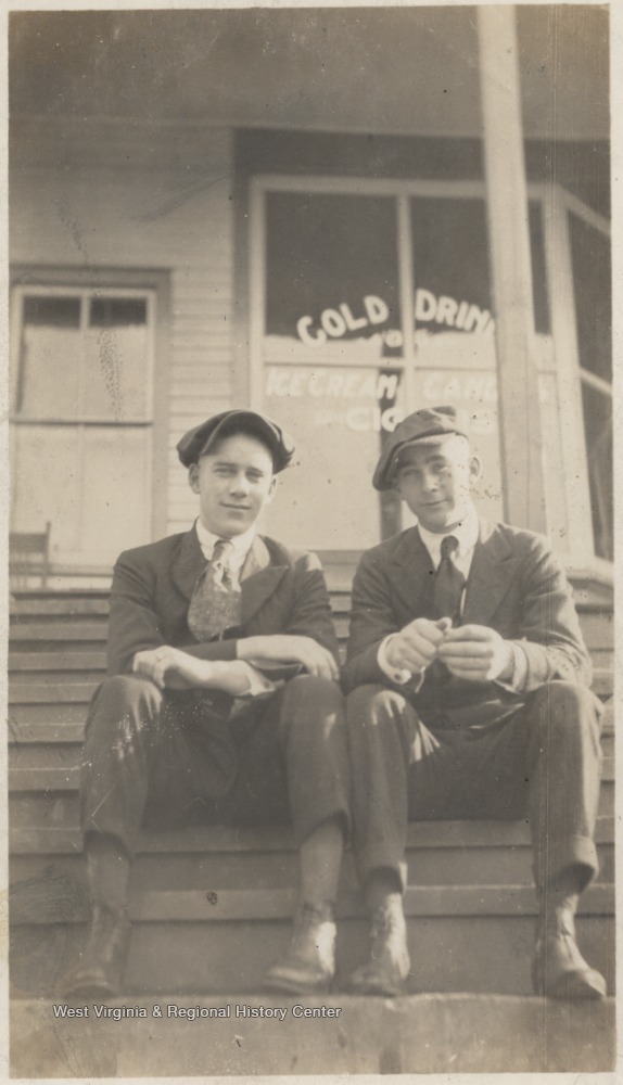 - Eldrige Hedrick, left, and Walker boy, right, sit in front of a store advertising "cold drinks, ice cream, candies, and cigars" in its window.