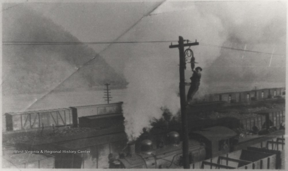 - Electrician Changing Bulbs on Pole near Roundhouse Building, Hinton, W. Va.