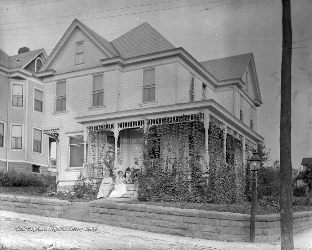 - Family With Their Dog Sits on Steps of Unidentified Corner Home, Morgantown, W. Va.